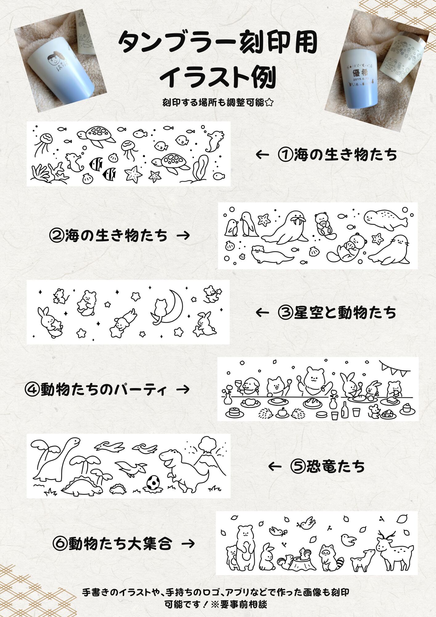 模様や字体などお好みのものがございましたらご相談ください♪お手持ちの画像も刻印可能か検討させていただきます★