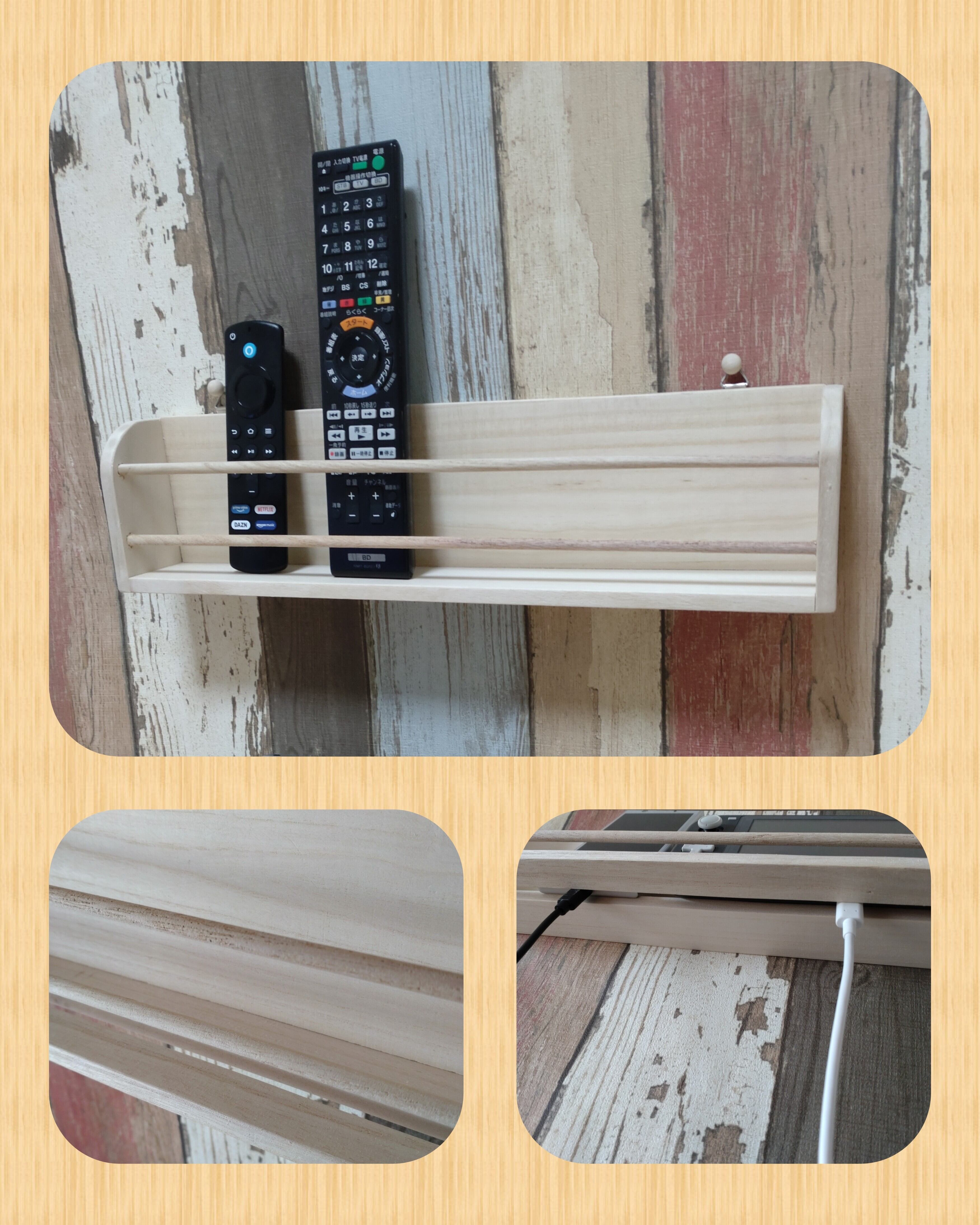 こちらはお手軽に壁に取り付け、お持ちのリモコンなどを立てられるラックになります♪
