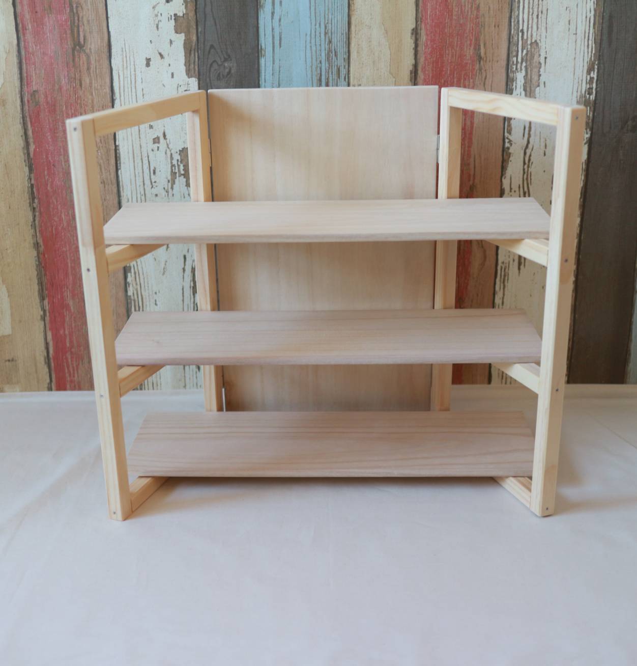 写真1枚目は天板の板幅が3枚とも150mm、写真2枚目は上段は90mm中段は120mm下段は150mmと、下段のお品物が見やすくなるように板幅を変えられます♪